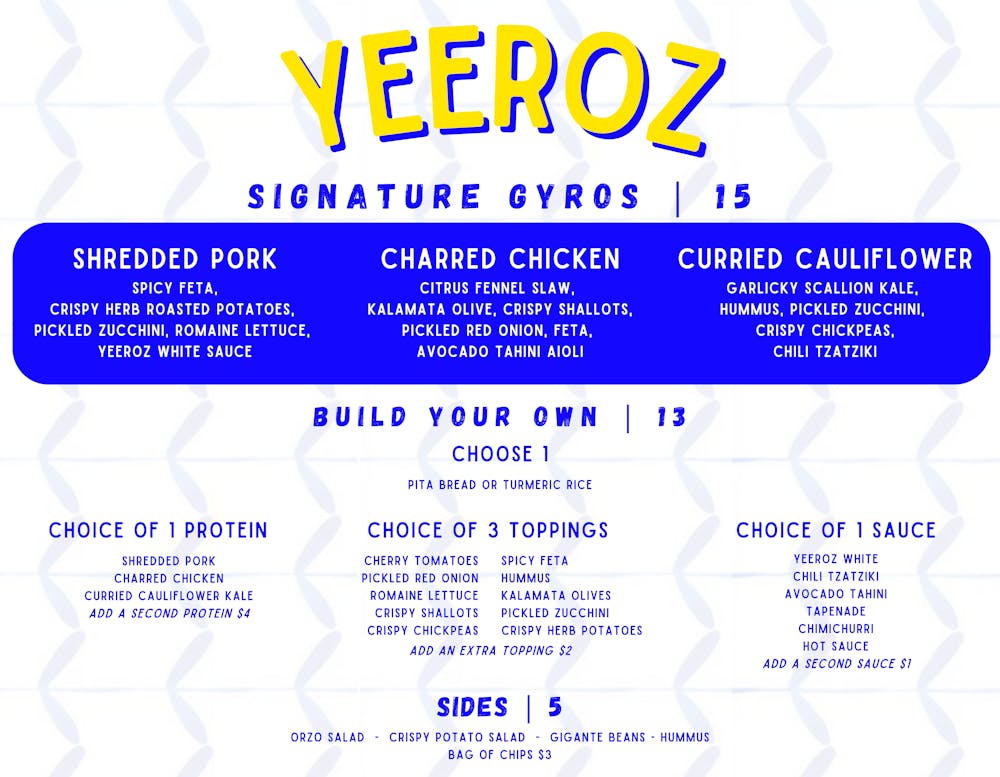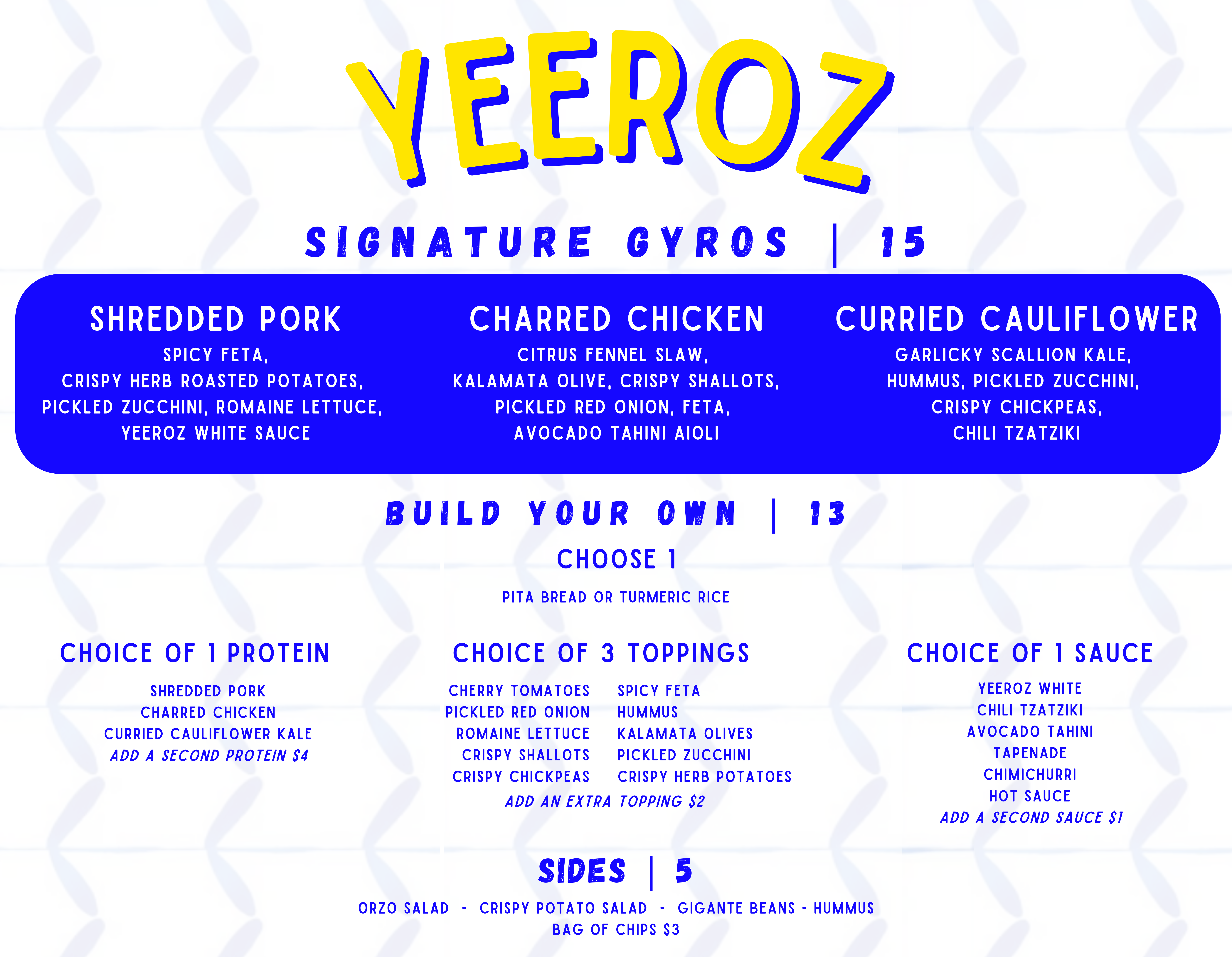 Our chefs marinate each protein and prep every component from scratch, all with fresh ingredients. Your choice of pita bread or turmeric rice, select from our signature gyros or create your own!!